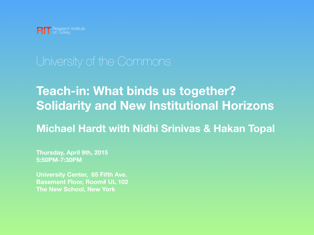 The University of the Commons RIT (Research Institute on Turkey)www.riturkey.org Teach-in: What binds us together? Solidarity and New Institutional Horizons Michael Hardt with Nidhi Srinivas & Hakan Topal Thursday, April 9th, 2015. 5:50PM-7:30PM