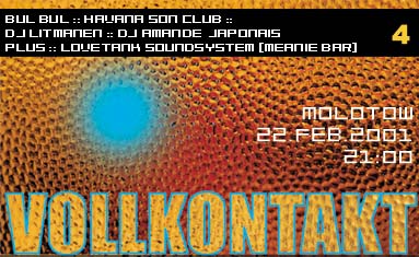 !!!!Ja, die Welt ist unser!!!! am: 22.02.01 ab: 21:00 Uhr im: MOLOTOW mit: * Havana Son Club (Cuba) Salsa, Son, Cha Cha Cha y Rumba *Bul Bul (Österreich) Post Industrial Punk im Sonnenblumendress *DJ Litmanen (1. FC Barcelona) Finnischer Tango und Humpa *DJ Amande Japonais (Japan-Frankreich) kirschblütenblättriger Electro vereinigt sich mit froschschenkelzartem Pop und in der Meanie Bar: das Lovetank Soundsystem Raggaraggaragga !!!!!Wie gesagt: Nuestro Mundo denn die Welt ist unser!!!!!! Eintritt wie immer: DM 12,00 an der Abendkasse DM 10,00 im Vorverkauf bei RockCity Hamburg e.V., Kleine Freiheit 1, Mo-Do von 11:00 bis 18:00 Uhr Herzliche Grüsse Eure Claudia Wildner RockCity Hamburg e.V. http://www.rockcity.de mail to: music@rockcity.de und auch hier wie immer: Organisiert von RockCity Hamburg e.V.: (http://www.rockcity.de) Präsentiert von Szene Hamburg: (http://www.szene-hamburg.de) Finanziert von der Hamburger Kulturbehörde und Viva 2: (http://www.hamburg.de/Behoerden/Kulturbehoerde/)( http://www.viva.tv/)