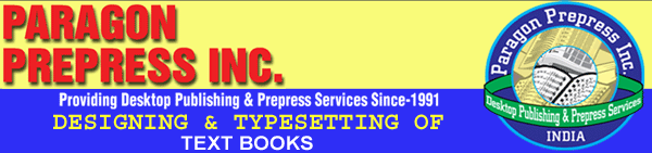 Paragon Prepress Inc. has been providing design, typesetting and pre-press services to Publishers, Business Houses and, Authors since 1991. Paragon can assist you with all your Desktop Publishing needs related to design and typesetting of books, journals, manuals, catalogs, brochures etc. Our experience covers all facets of book production (we specialize in math’s, physics, chemistry & botany books). We will not only help you in cutting costs and fixed overheads but also provide you with full support in achieving tight schedules and targets.